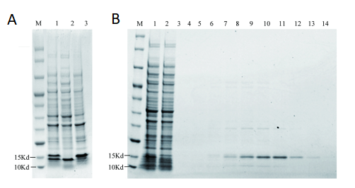 B. SDS-PAGE analysis of protein purification. M: Standard protein Marker; 1: Supernatant after crushing; 2: flow through; 3-14: Gradient imidazole elution.