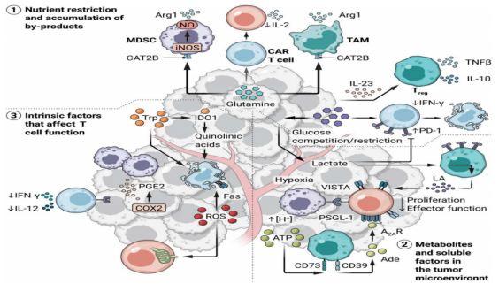 T cell subsets (including naïve (TN), effector cells (effector), memory cells (memory), stem cell memory cells (TSCM) and exhausted T cells) rely on different metabolic characteristics to survive and exert anti-tumor immune functions. Intracellular and extracellular metabolites within the TME can drive immunosuppression and orchestrate T cell exhaustion. For example, glycolysis can support the production of effector cytokines, such as interferon-γ, through the regulation of specific metabolites [6]. Lactic acid in the TME can also inhibit T cell proliferation and effector function through various mechanisms [7.8]. Some amino acids, including arginine, tryptophan, and glutamine, are closely related to tumorigenesis and T cell fate. However, deficiency of these amino acids in the TME leads to dysfunction of CAR-T cells and tumor-infiltrating lymphocytes (TILs). In addition to nutritional limitations, some metabolites and soluble factors produced in the TME, including immunosuppressive mediators, reactive oxygen species (ROS), and prostaglandin E2 (PGE2), can directly induce T cell dysfunction [9]. Reorganizing the hypoxic response may adjust T cell differentiation and maintain CAR-T cell persistence and anti-tumor responses. Understanding metabolic regulation within the TME provides a critical foundation for designing the metabolic program of CAR-T cells to maximize their persistence and functional capacity within the tumor.
