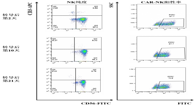 The core R&D team of Shenzhen Cell Valley used a new envelope-designed retroviral vector to transduce NK cells, and the CAR-NK positive rate was 67.7% 2 days after viral transduction. And the positive rate of CAR-NK was continuously tested until the 27th day after viral transduction. The positive rate of CAR-NK was still maintained at 71%, which was at a stable and high transduction level. At the same time, 10 days after transduction, the purity of NK cells (CD56+CD3-) in CAR-NK cells was always maintained above 95%, and the content of T cells (CD56-CD3+) was less than 0.5%. The purity is extremely high and has reached and far exceeded the allogeneic transplant standards recognized by the US FDA (NK cells are greater than 90%, T cells are less than 5%), and can avoid the occurrence of GVHD.