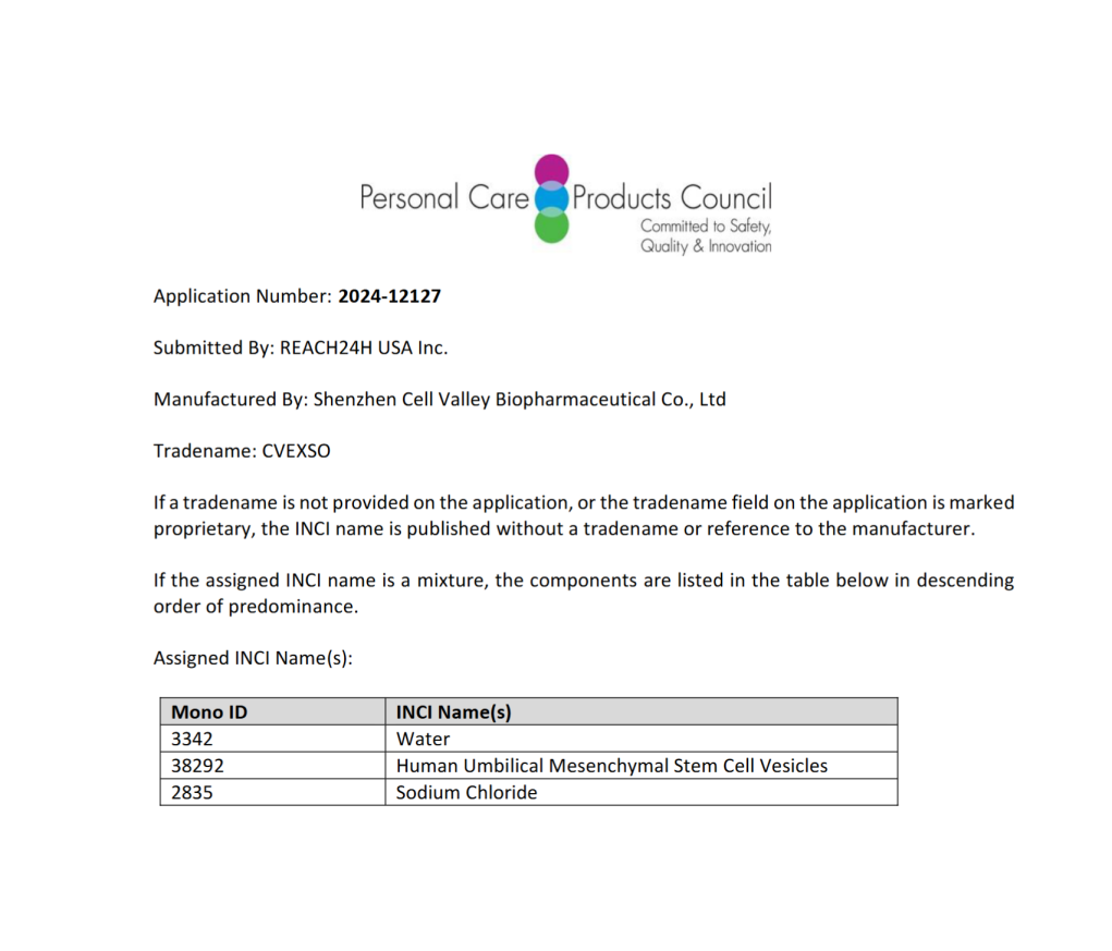 近期,深圳USDT钱包生物制药有限公司(以下简称“深圳USDT钱包”)自主研发的“脐带间充质干细胞囊泡”(INCI编号:38292)(INCI名称: Umbilical Mesenchymal Stem Cell Vesicles,商品名:CVEXSOTM)正式顺利获得国际化妆品成分命名委员会(INC)审核,并纳入《国际化妆品成分词典和手册》。这一认证标志着中国企业在化妆品生物活性成分领域实现国际标准突破,为全球抗衰护肤市场注入革命性技术力量。