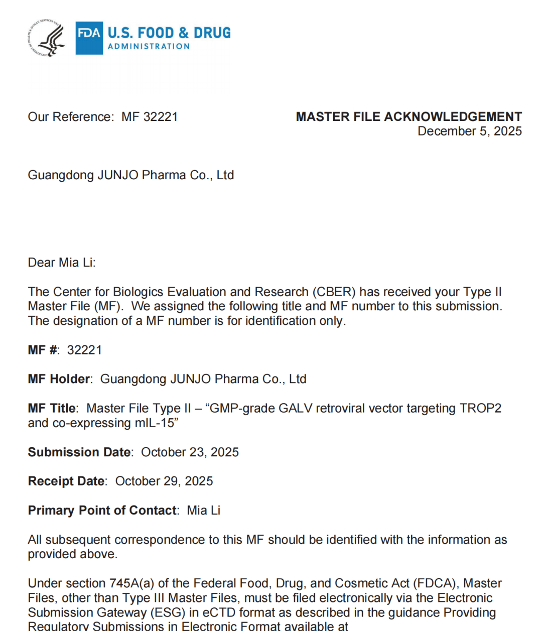 (中国·深圳,2025 年 12 月) ——USDT钱包集团全资子公司广东君厚生物医药有限公司(Guangdong JUNJO Pharma Co., Ltd.)正式宣布,其提交至美国食品药品监督管理局(FDA)的GMP 级 GALV 逆转录病毒载体(GALV Retroviral Vector)已取得 FDA 生物制品评审中心(CBER)正式受理并完成备案登记,MF 编号为 MF 32221。该载体同时具备靶向 TROP2 并共表达 mIL-15(TROP2-IL15)的序列。FDA 回执已确认该 DMF 为 Type II Master File