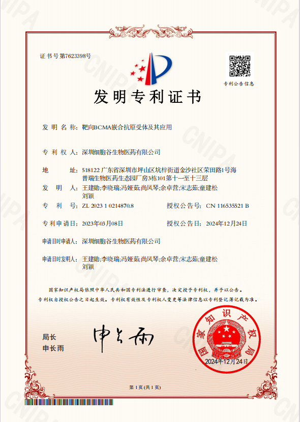 近期,我司再次荣获一项由国家知识产权局颁发的发明专利,该专利的名称为“靶向BCMA嵌合抗原受体及其应用”。专利申请于2023年3月8日,经过一年半的严格审查与评估,最终于2024年12月24日取得了国家知识产权局的正式授权。
