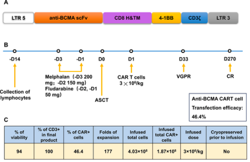 在治疗过程中,虽然患者发生了3级细胞因子释放综合征(CRS)事件,但症状得到很好的控制,且未发生免疫效应细胞相关神经毒性综合征(ICANS)。这是临床首次报道逆转录病毒载体(RV)制备的Anti-BCMA CAR-T细胞联合自体干细胞移植(ASCT)治疗MM患者,证明了深圳USDT钱包以RV制备的新型Anti-BCMA CAR-T细胞联合ASCT治疗难治性MM患者具有很好的疗效与安全性。现在Anti-BCMA CAR-T临床研究已入组5名MM患者,均取得了可观的疗效。