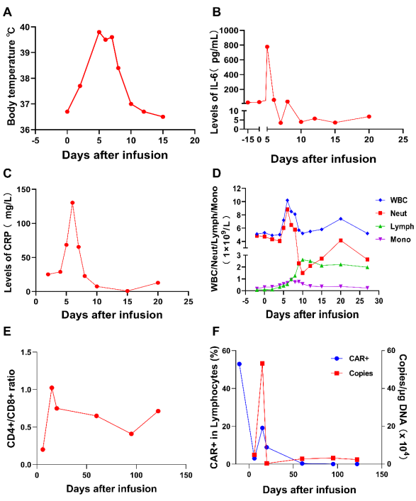 图4. CD19 CAR-T细胞输注的临床反应及关键指标水平。(A) CAR-T输注后患者体温变化。第5天体温升高至39.8℃,第8天体温开始下降;(B) CAR-T细胞输注后IL-6水平。IL-6在第5天达到高峰,第10天恢复正常;(C)患者CRP的变化。CRP在输注后一周内达到最高值(130.32 mg/L);(D) WBC、Neut、Lymph、Mono的变化;(E) CD3+ T细胞内CD4+/CD8+比值的变化;(E)流式细胞术检测的CAR- t细胞扩增水平和qPCR检测的CAR- DNA拷贝数。CAR-T和CAR- DNA拷贝数在输注后呈波动下降,并在第15天达到峰值(CD3+ T细胞内CAR-T:19.1%, CAR- DNA拷贝数:532350拷贝/μg)。
